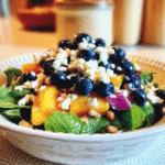 A refreshing summer salad bursting with juicy peaches, sweet blueberries, and creamy feta, perfect for picnics or elegant dinners.